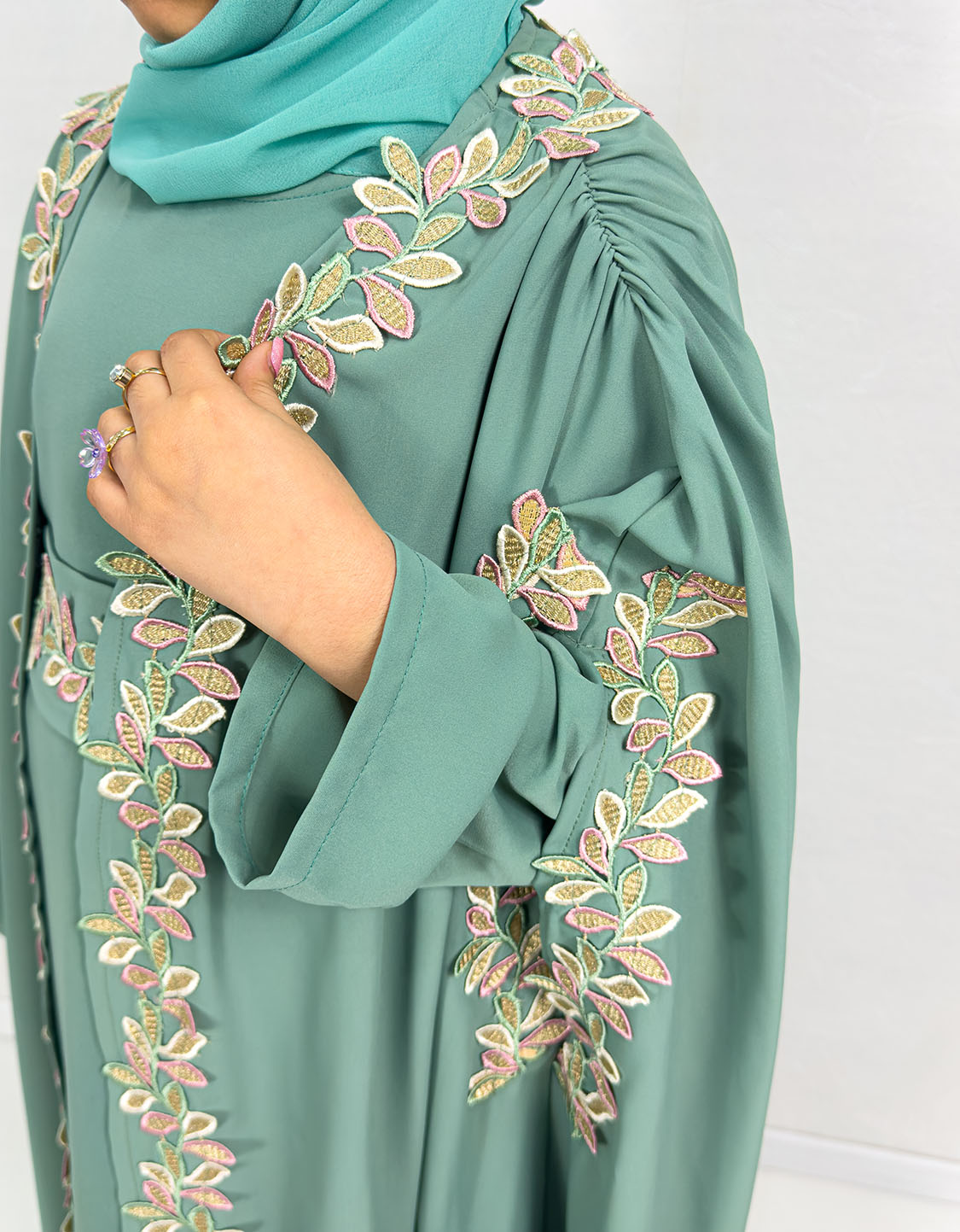 Luxury Cape Abaya Set With Leaf Embroider Applique – Caribbean Turquoise
