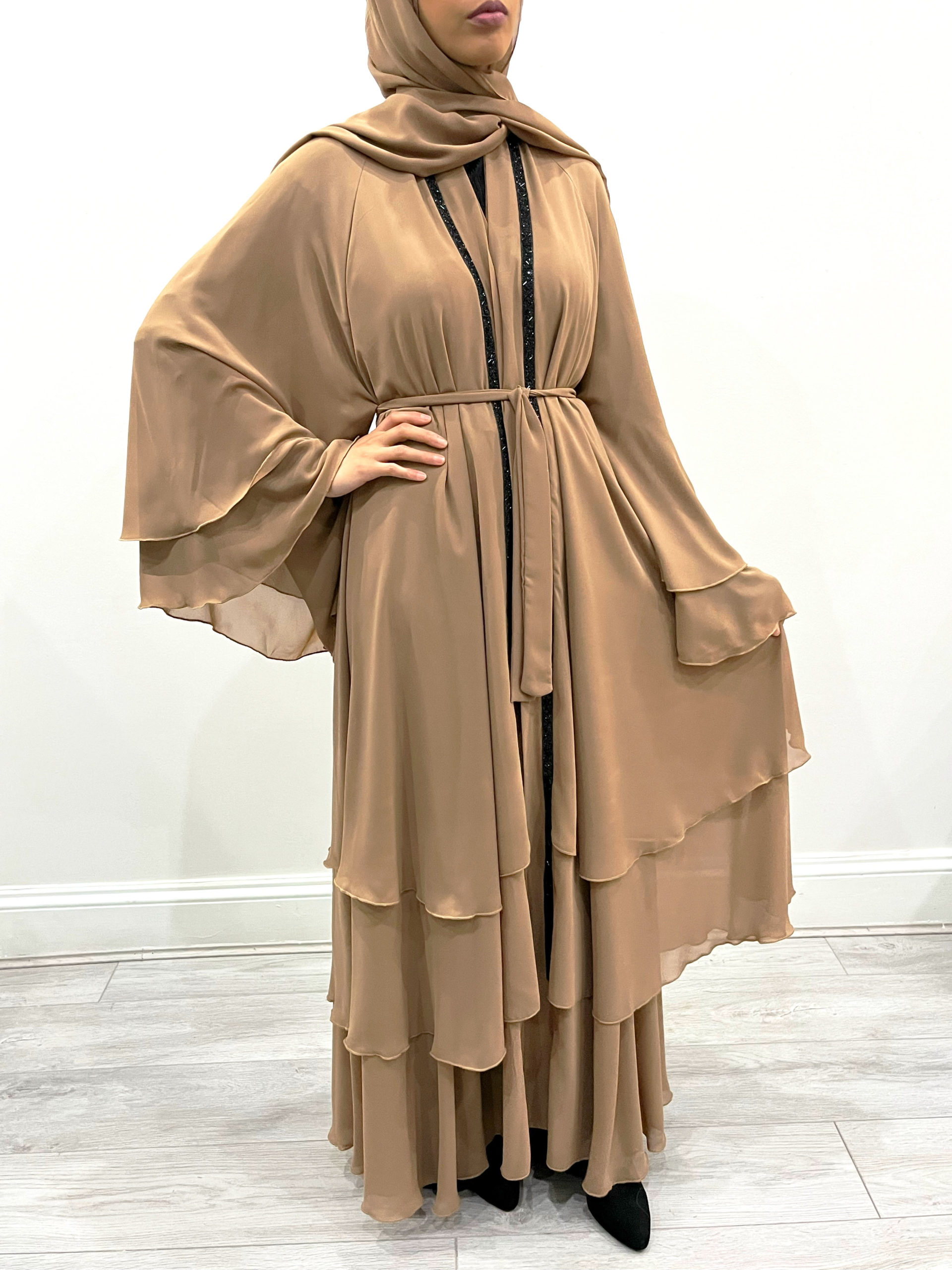 Amani’s Caramel Embellished Chiffon Layered Open Abaya
