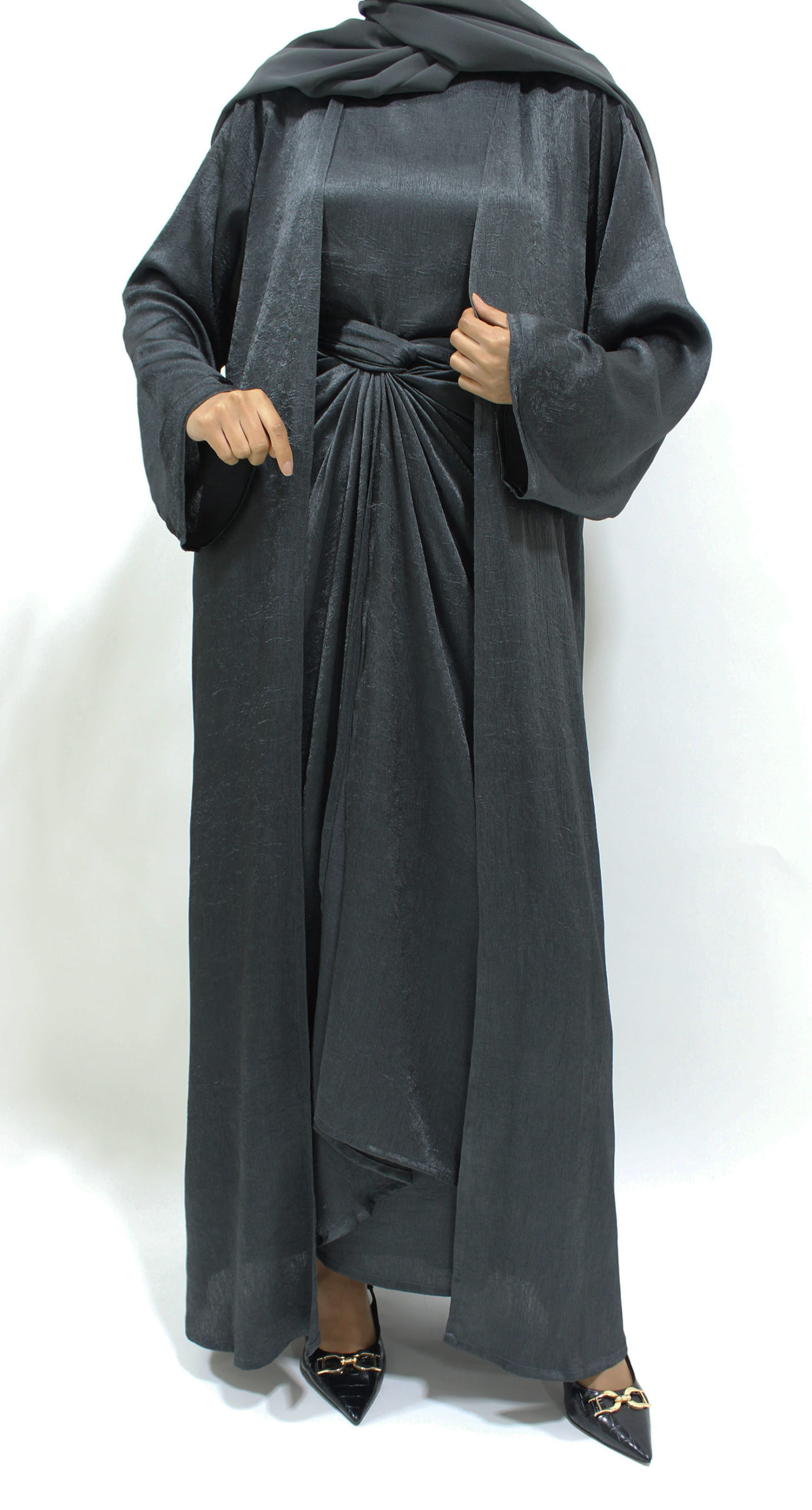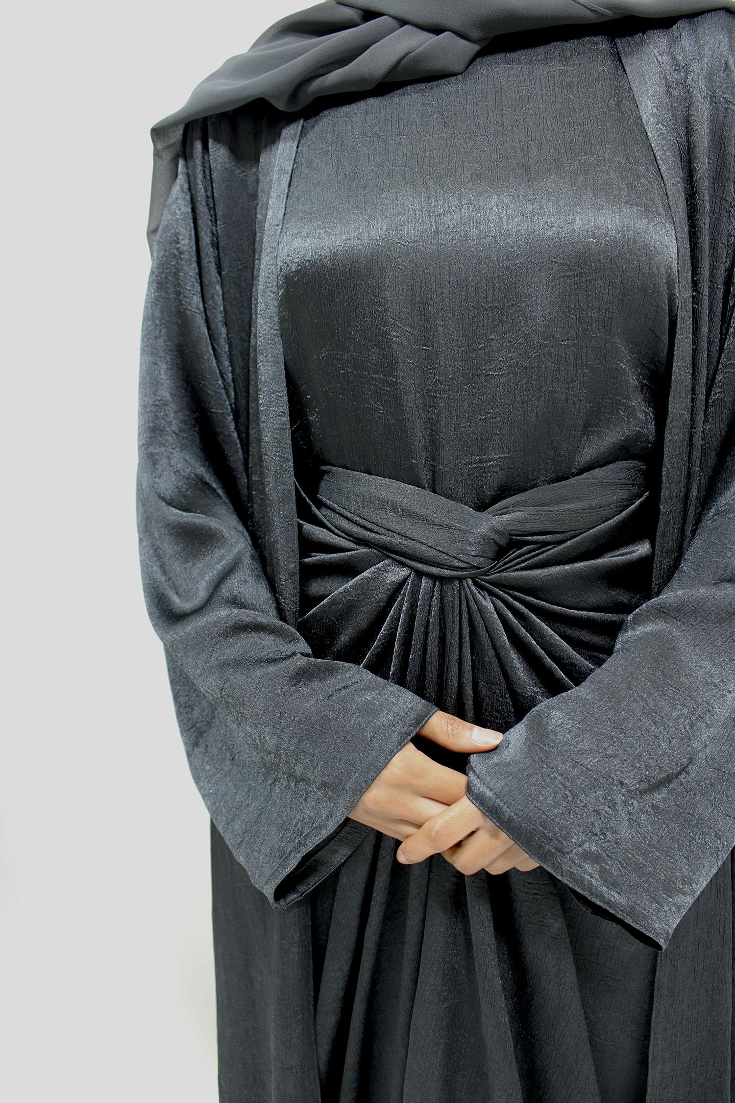 Amanis Limited Edition 4 Piece Crushed Satin Open Abaya Set – Anchor Grey