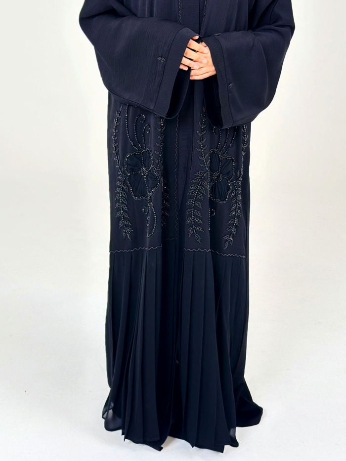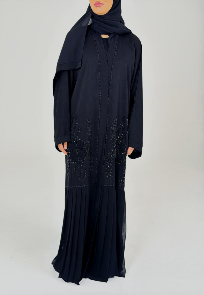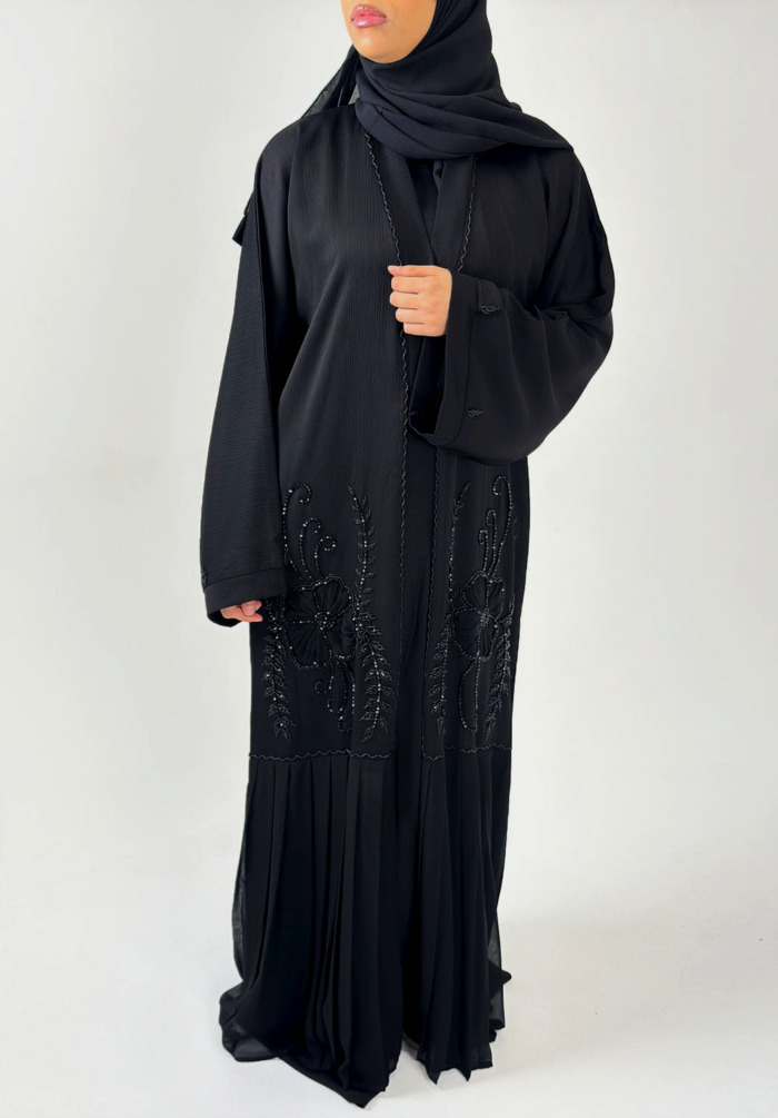 This stunning black on black embellishment open abaya is beautifully crafted from premium Zoom abaya fabric with hand stitched embellishments on the front. Make this your perfect Eid abaya.