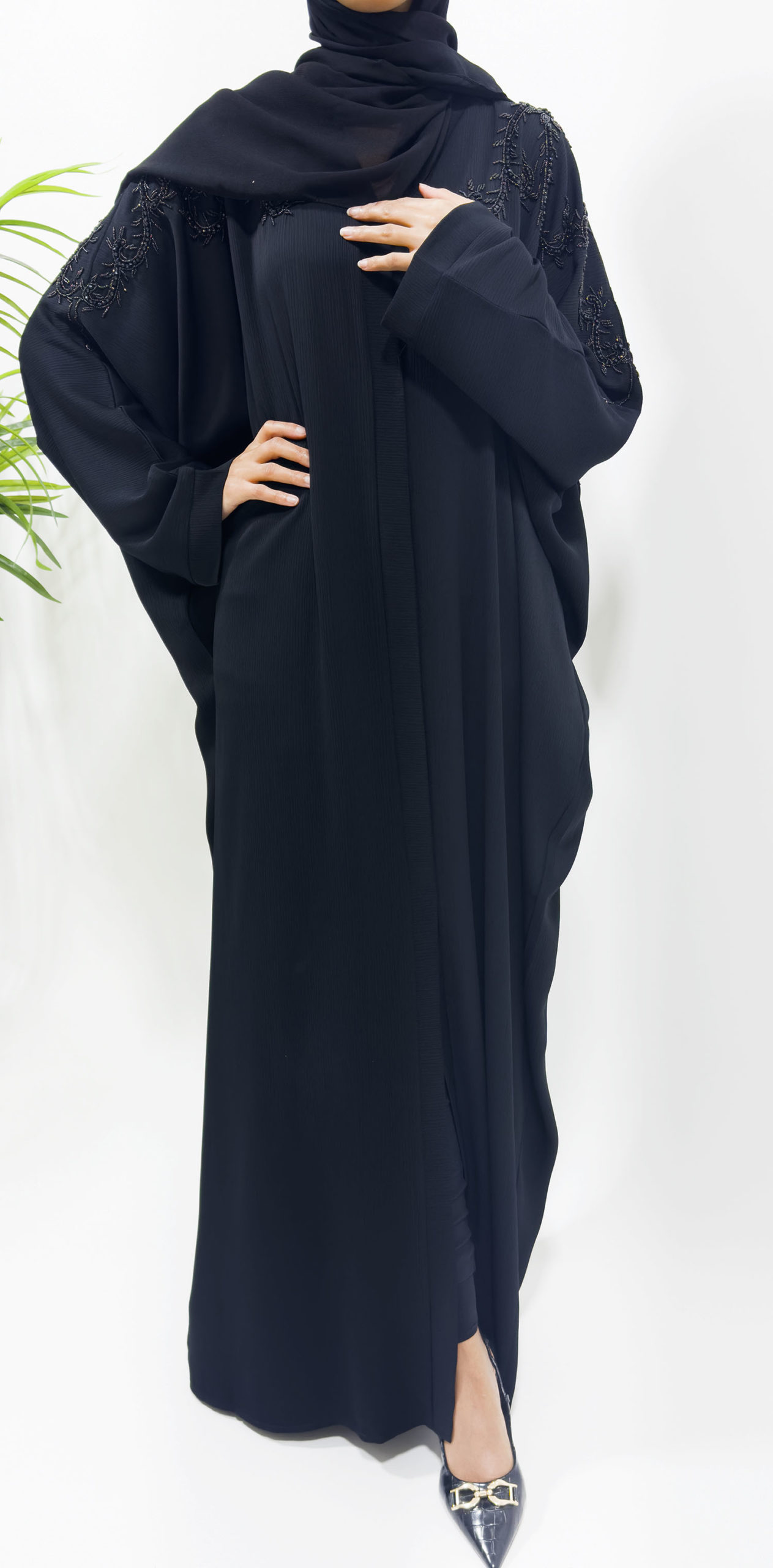 Our luxurious Black On Black Embellished Open Batwing Abaya exudes elegance and sophistication. Hand-stitched black beading adorns the shoulders and back, offering a subtle yet striking design. Made from premium zoon fabric, this open batwing abaya provides comfort and grace for any occasion. It comes with a matching scarf to complete the look, making it perfect for formal events or everyday wear.