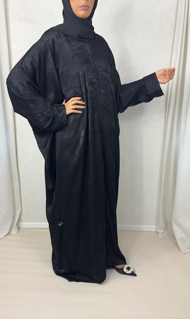Introducing our Black Rose Satin Foil Open Abaya. Made from premium quality Rose Satin Foil crepe making this abaya luxurious and elegant. Wear it with your favourite heels accessories and let this abaya do the talking. Complete with black scarf, this abaya is perfect for all occasions.