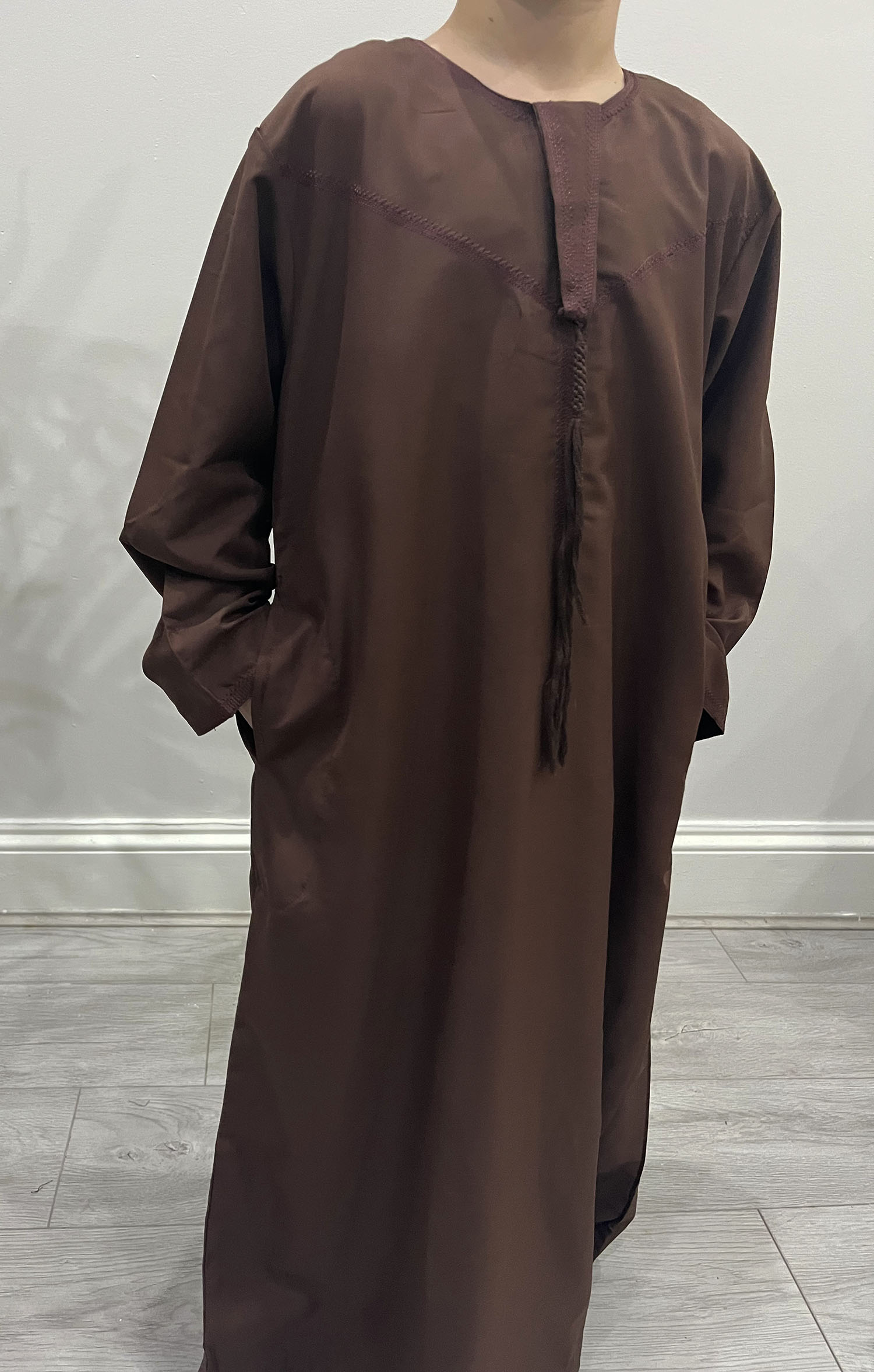 Introduce your little one to traditional fashion with the Boys Chocolate Emirati Thobe. This elegant thobe features a timeless chocolate color and classic round neckline, offering a traditional look perfect for any occasion. Whether it’s a family event, religious gathering, or everyday wear, this thobe will be a staple in your child’s wardrobe.