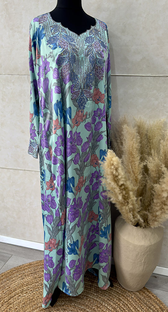 Enhance your wardrobe with the Multi Floral Print Mukhawar Jalabiya Dress, featuring a beautiful digital floral pattern. This dress features long sleeves and a sophisticated cut work neck. Detailed embroidery work on the chest and cuffs, along with sparkling crystal diamante accents, offering a touch of glamour. Crafted from high-quality polyester satin, it includes a matching scarf for a cohesive look. Designed in a free size to accommodate up to size 16 UK, it boasts a length of approximately 58 inches from shoulder to heel.
