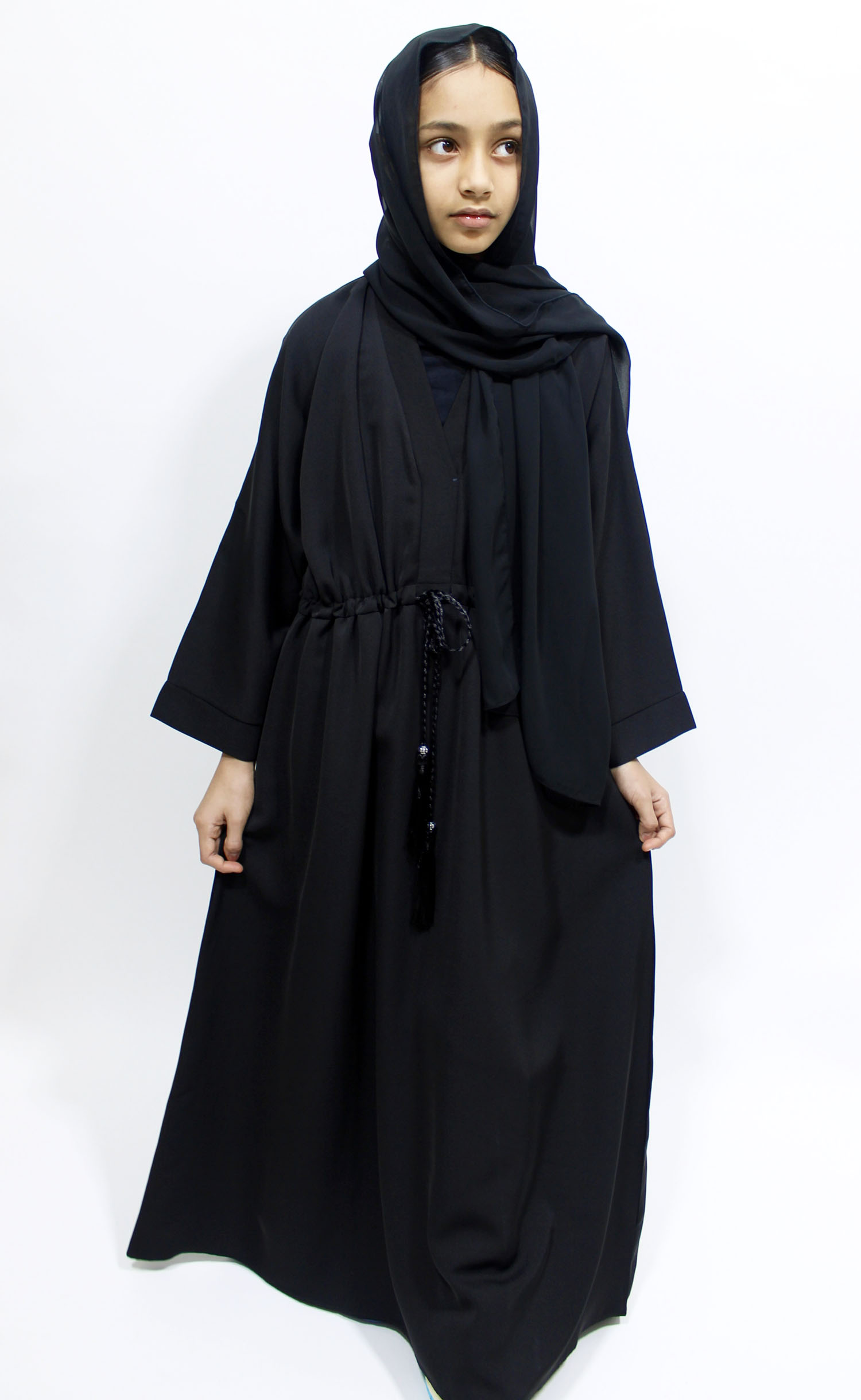 Make a timeless statement with our Girls Black Draw String Abaya. Crafted from premium Neda fabric, this elegant black abaya is lightweight and perfect for any occasion. The adjustable drawstring belt and matching kids’ size scarf ensure a complete, polished look. The abaya’s sleek design is enhanced with a black lace border, making it a stylish option for both casual and special events.