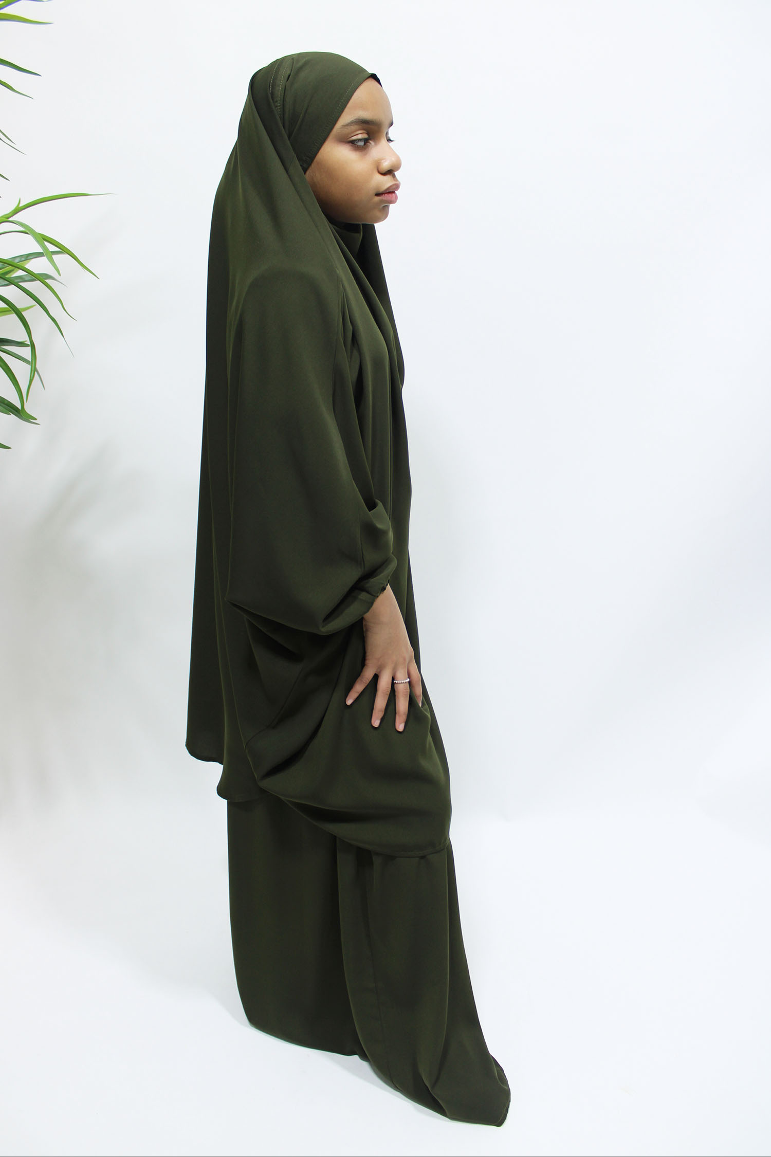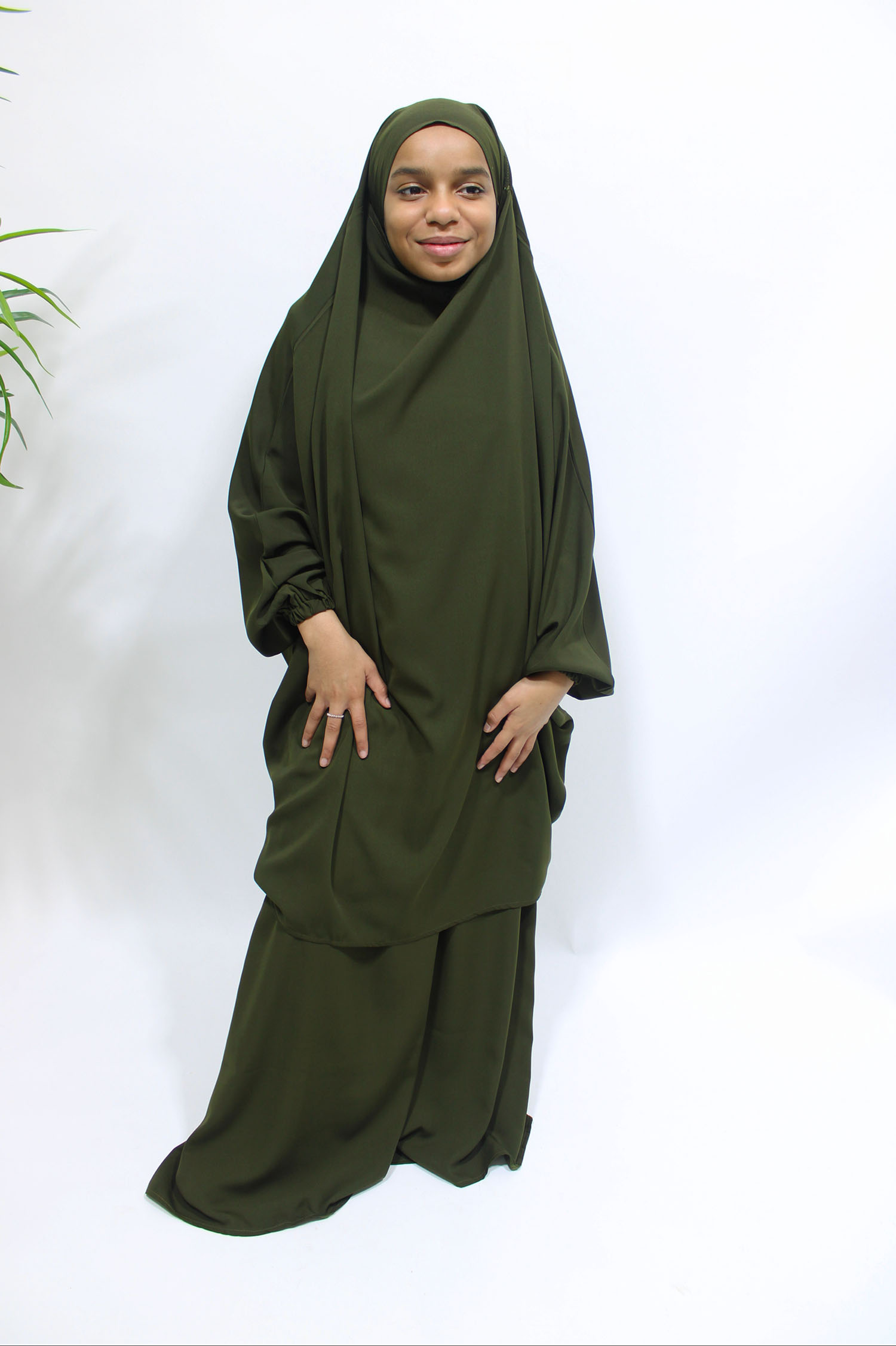 The Girls Jilbab and Skirt Set in Olive Green is a modest and stylish two-piece set designed for comfort and elegance. The set includes a half jilbab with tie-back straps and a long skirt with an elasticated waist for an adjustable fit. Made from lightweight crepe fabric, it offers comfort without compromising on modesty. The fabric is soft and easy to iron, making it a practical choice for both everyday use and formal occasions. This set is an excellent option for young girls seeking a modest yet fashionable look.