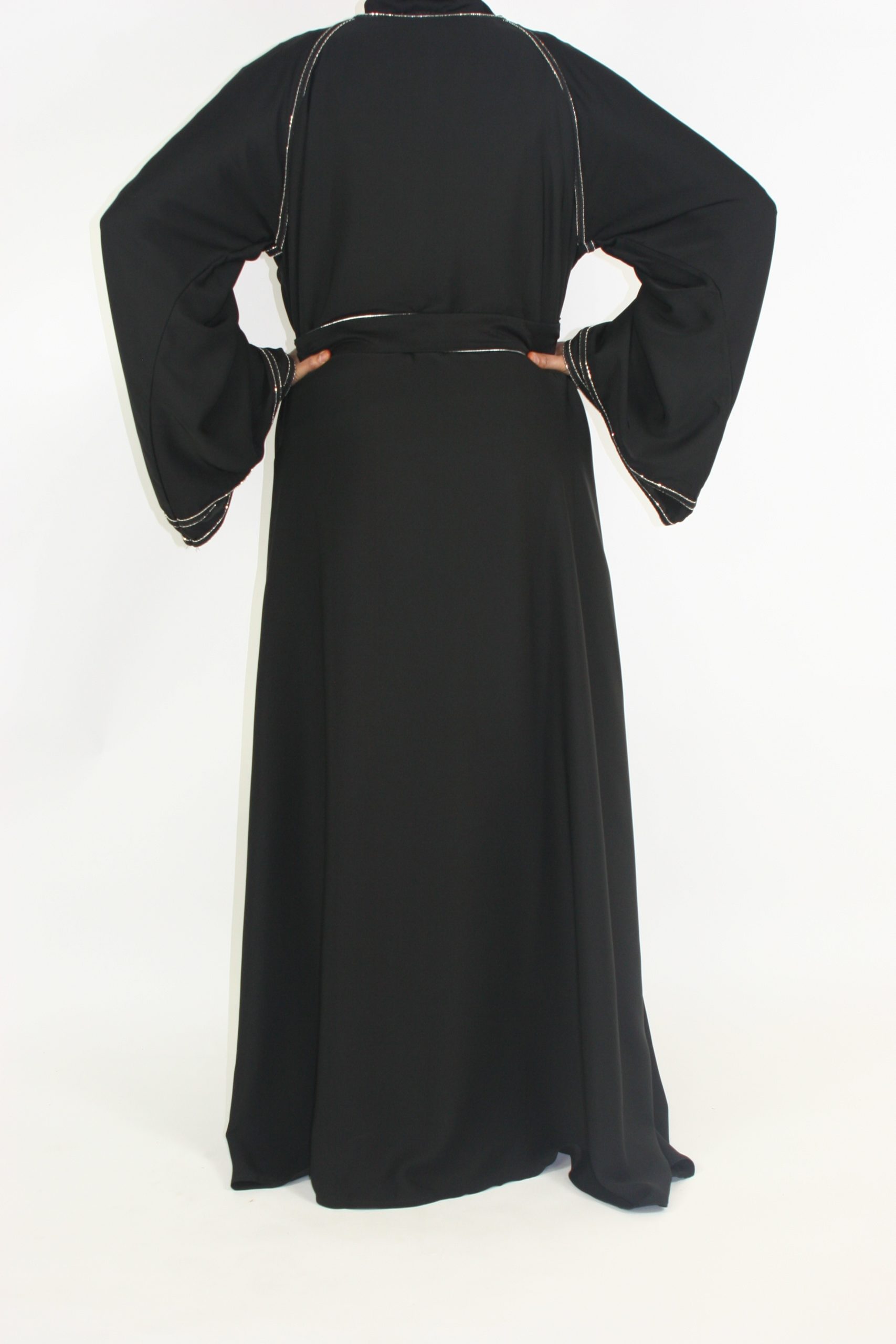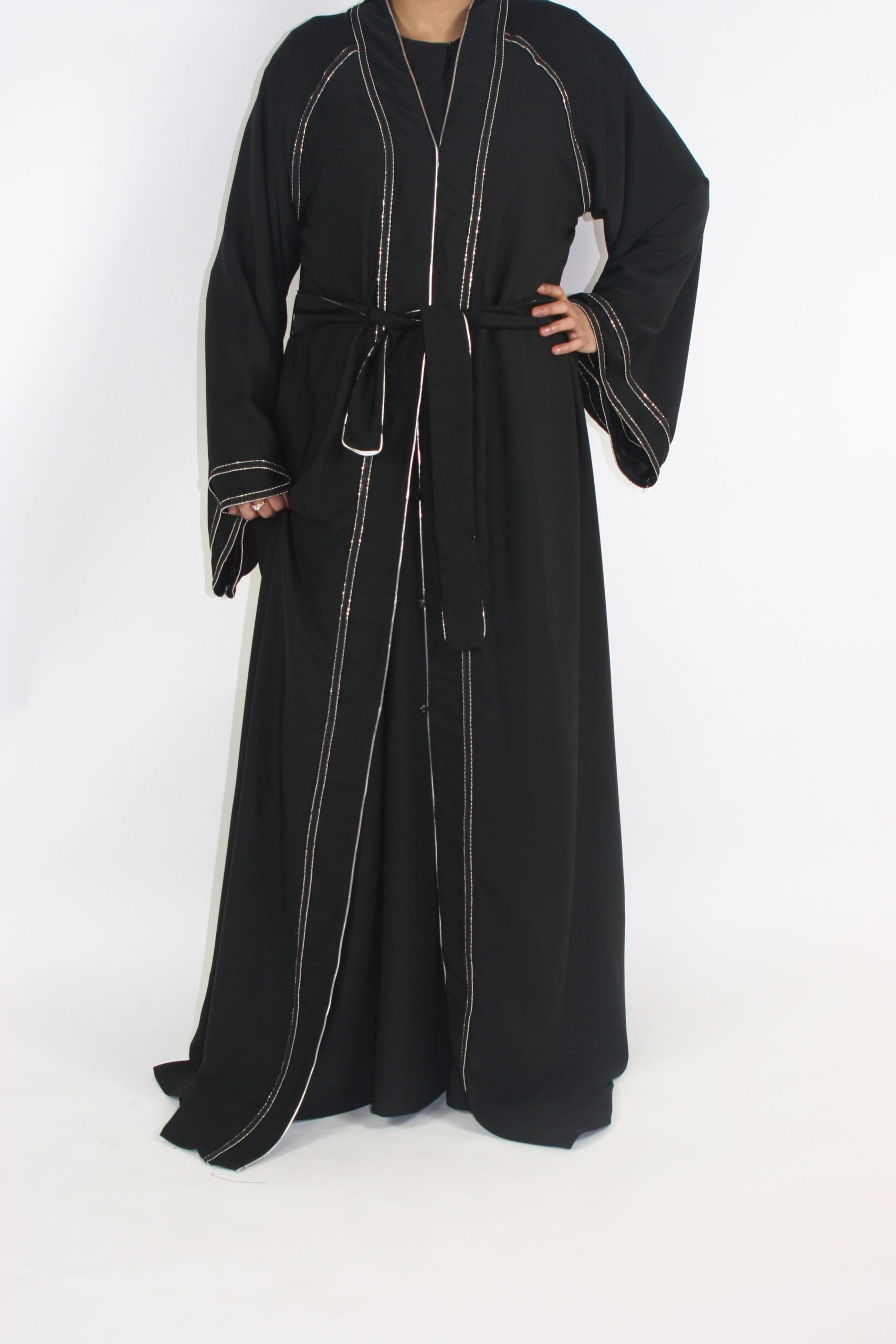 Step into elegance with Amani’s Open Abaya UK With Silver Lined Borders. This stunning open abaya is designed to make a statement with its luxurious silver-lined borders. The V-neckline with snap button closures and the A-line cut with bell sleeves ensure a flattering and comfortable fit. The external belt, also adorned with silver, adds a refined finishing touch.