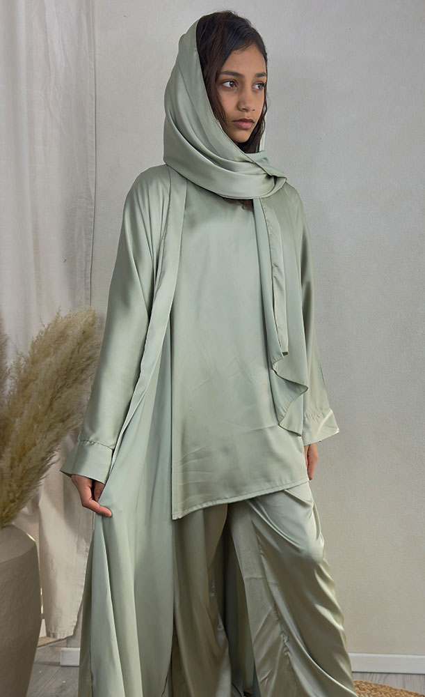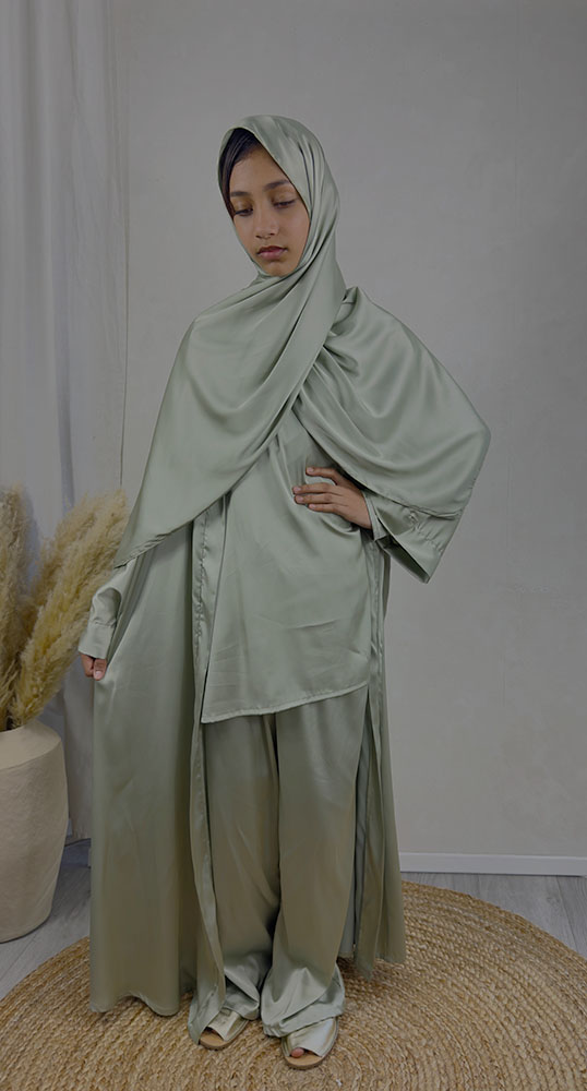 New Childrens 4-Piece Trouser Abaya Set – Sage Green