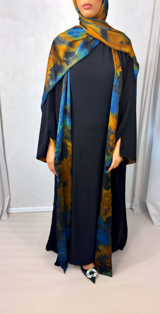 NEW Open Abaya With Satin Chiffon Lining – Blue & Orange Hues