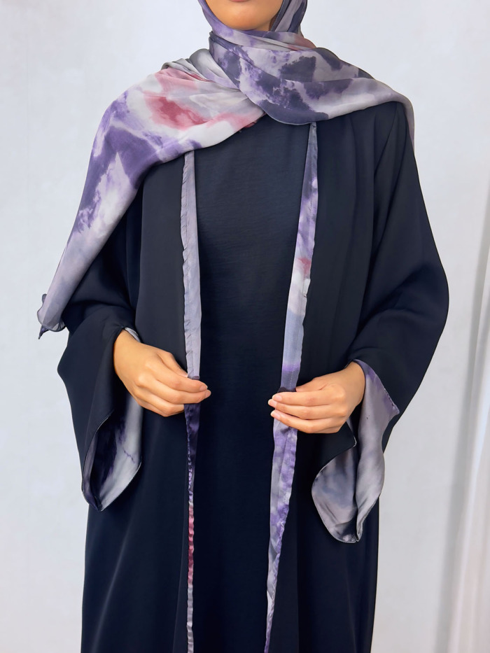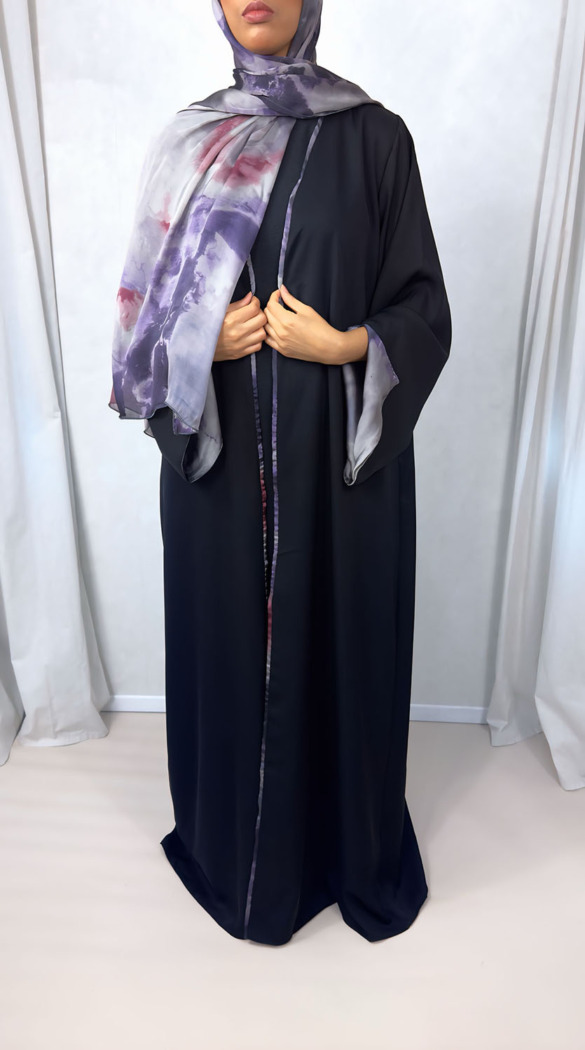 Introducing our exclusive black open Abaya with watercolour satin chiffon lining. Crafted to perfection, this Abaya with its matching scarf is perfect for any occasion.