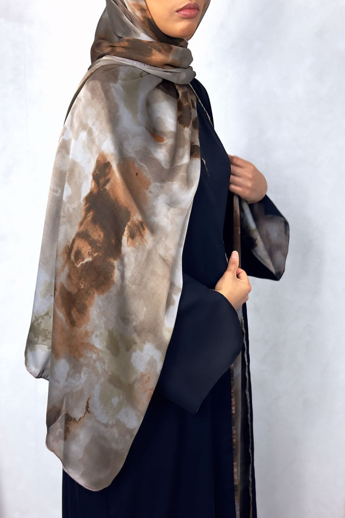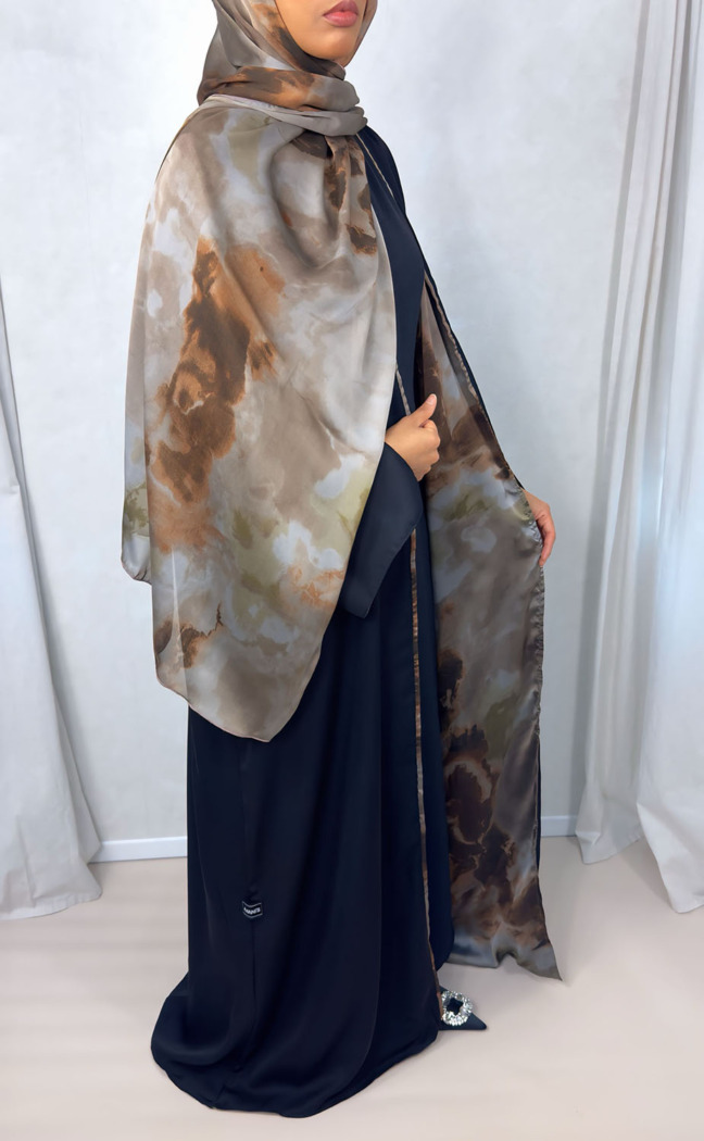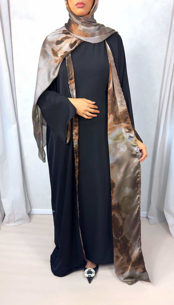 Introducing our exclusive black open Abaya with watercolour satin chiffon lining. Crafted to perfection, this Abaya with its matching scarf is perfect for any occasion.