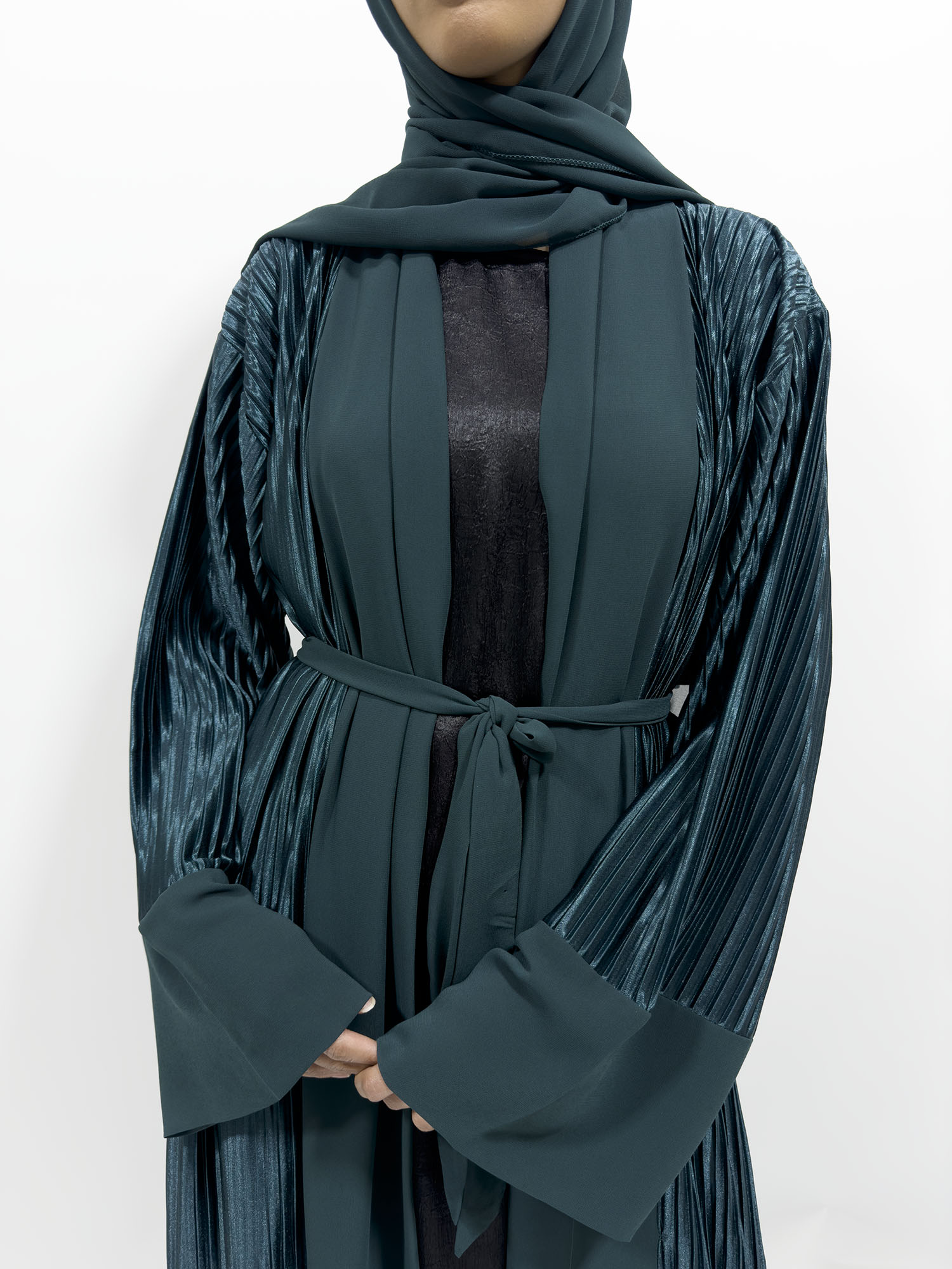 Infuse your wardrobe with the rich tones of the Premium Pleated Satin Open Abaya in Green Teal. Perfect for any occasion, this abaya is crafted from high-quality pleated satin, delivering a luxurious and elegant finish. The set includes a matching belt and hijab, providing you with multiple styling options. Please note that the inner slip dress is not included, allowing you to personalize your look.