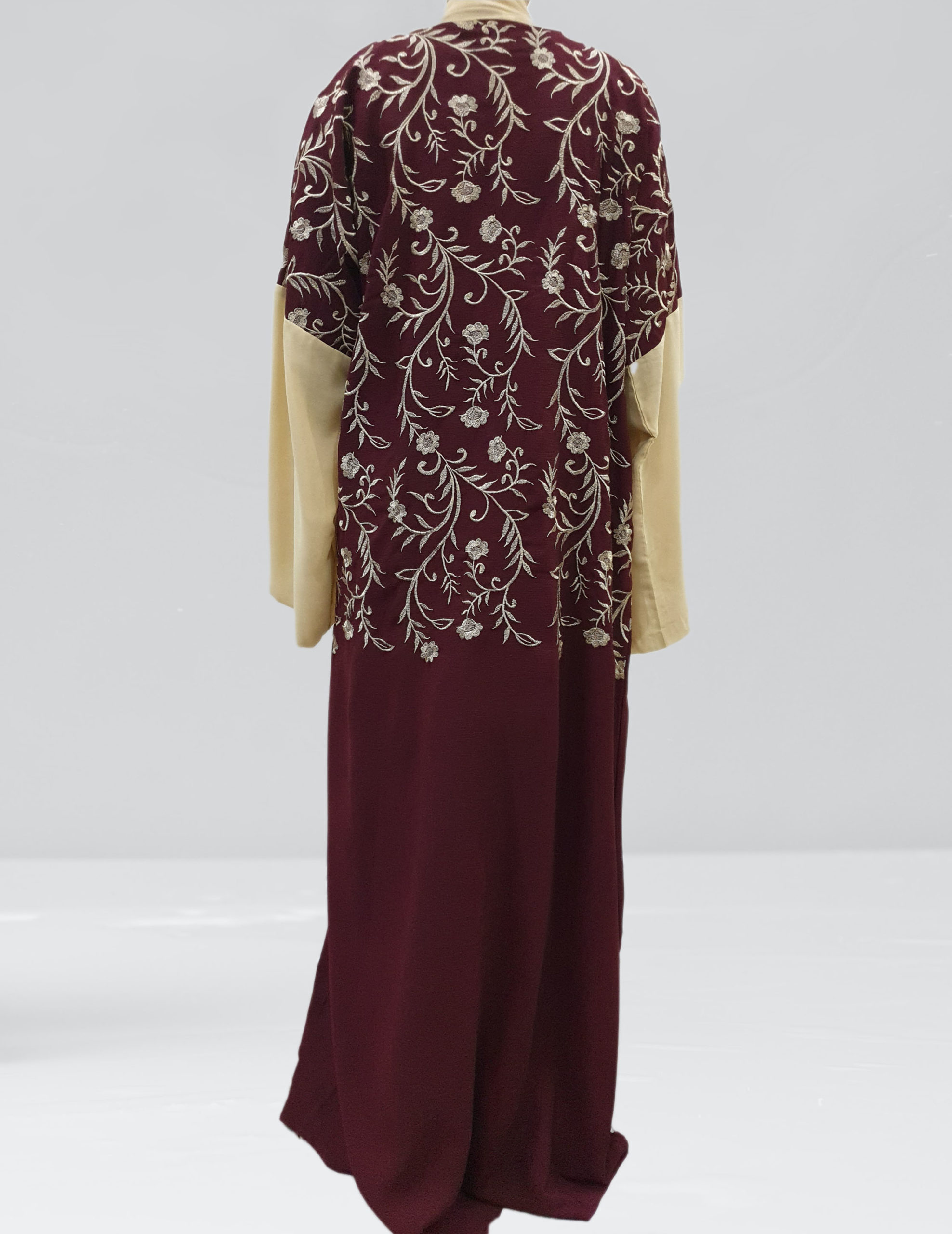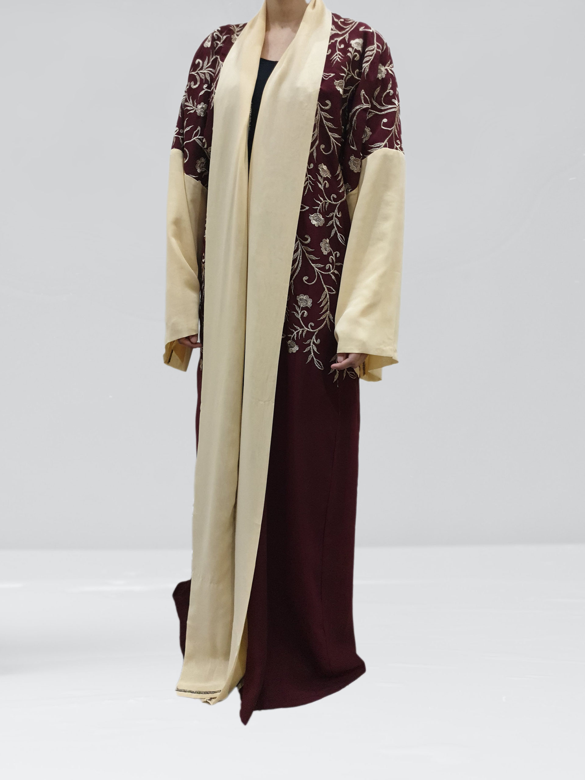 Make a bold statement in the Reem Open Abaya. This striking abaya features a beautiful burgundy color with gold embroidery, making it an eye-catching piece that is sure to make you stand out. Made from premium cotton and polyester, this abaya is both comfortable and durable.