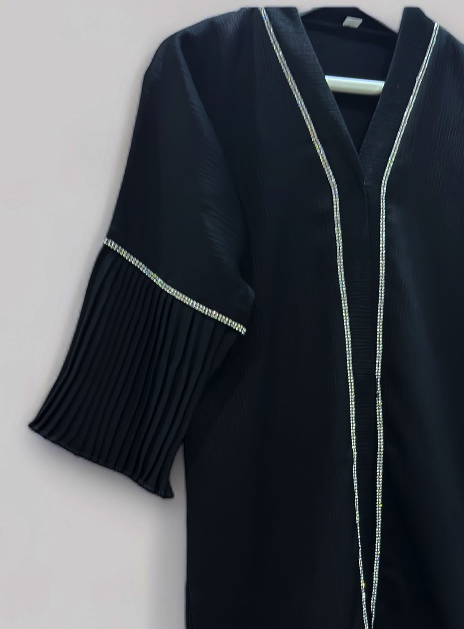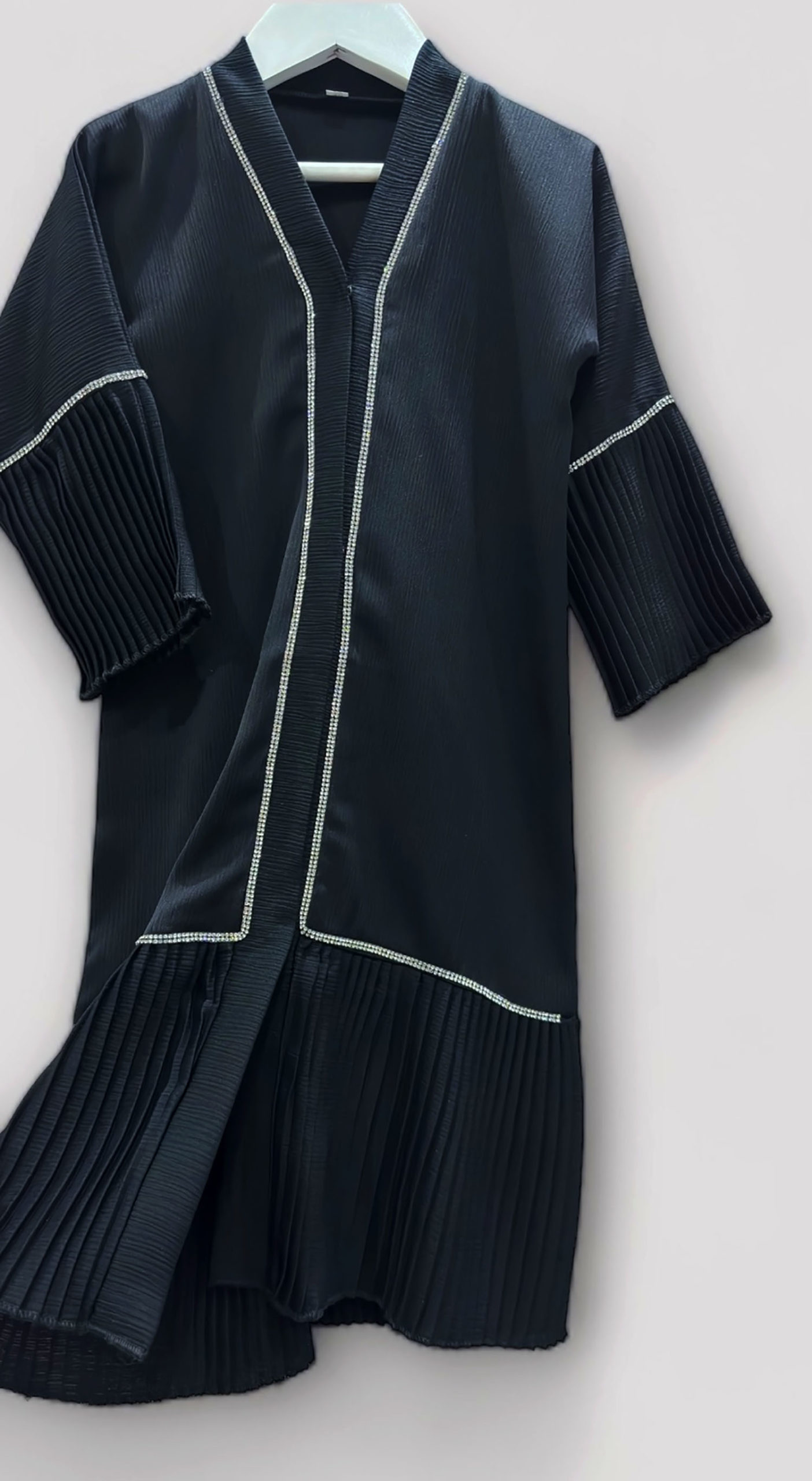Add a touch of elegance to your toddler’s wardrobe with this Silver Embellished Open Abaya. Crafted from high-quality Zoom fabric, this abaya features sophisticated silver embellishments and stylish pleats at the sleeves and hem. The set includes a matching hijab and belt, making it a complete outfit for special occasions.