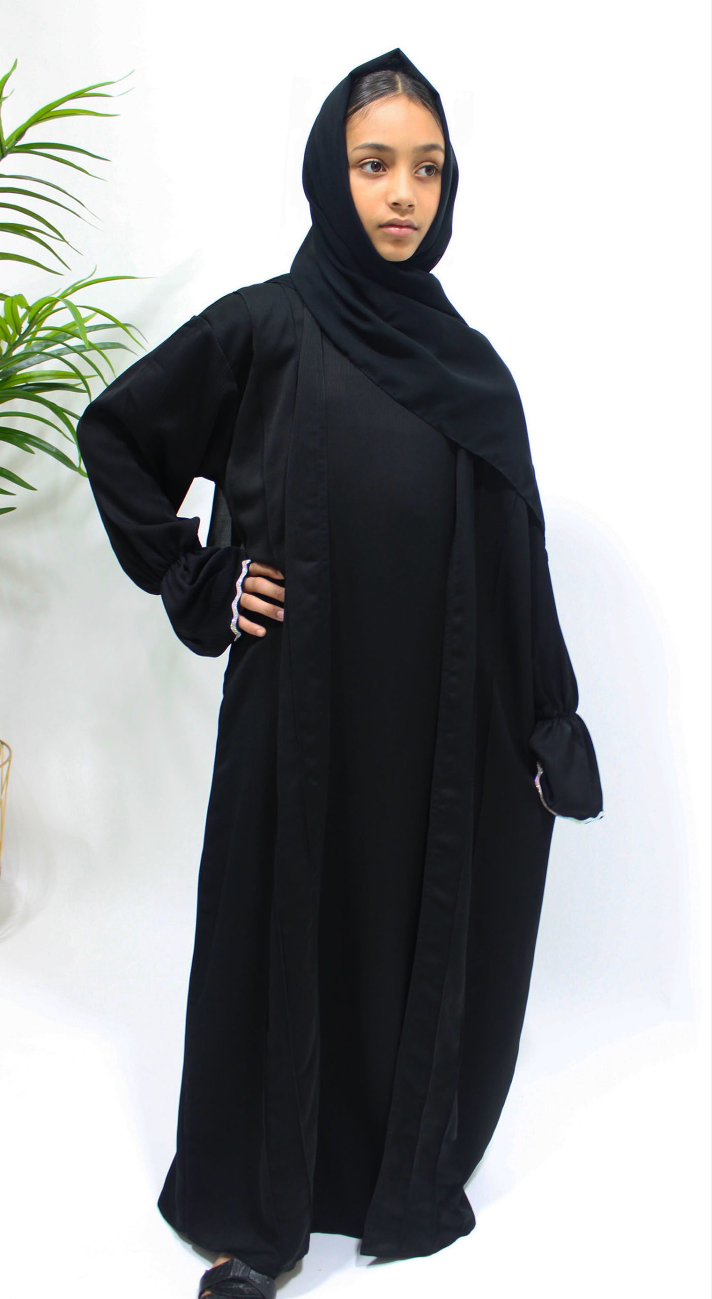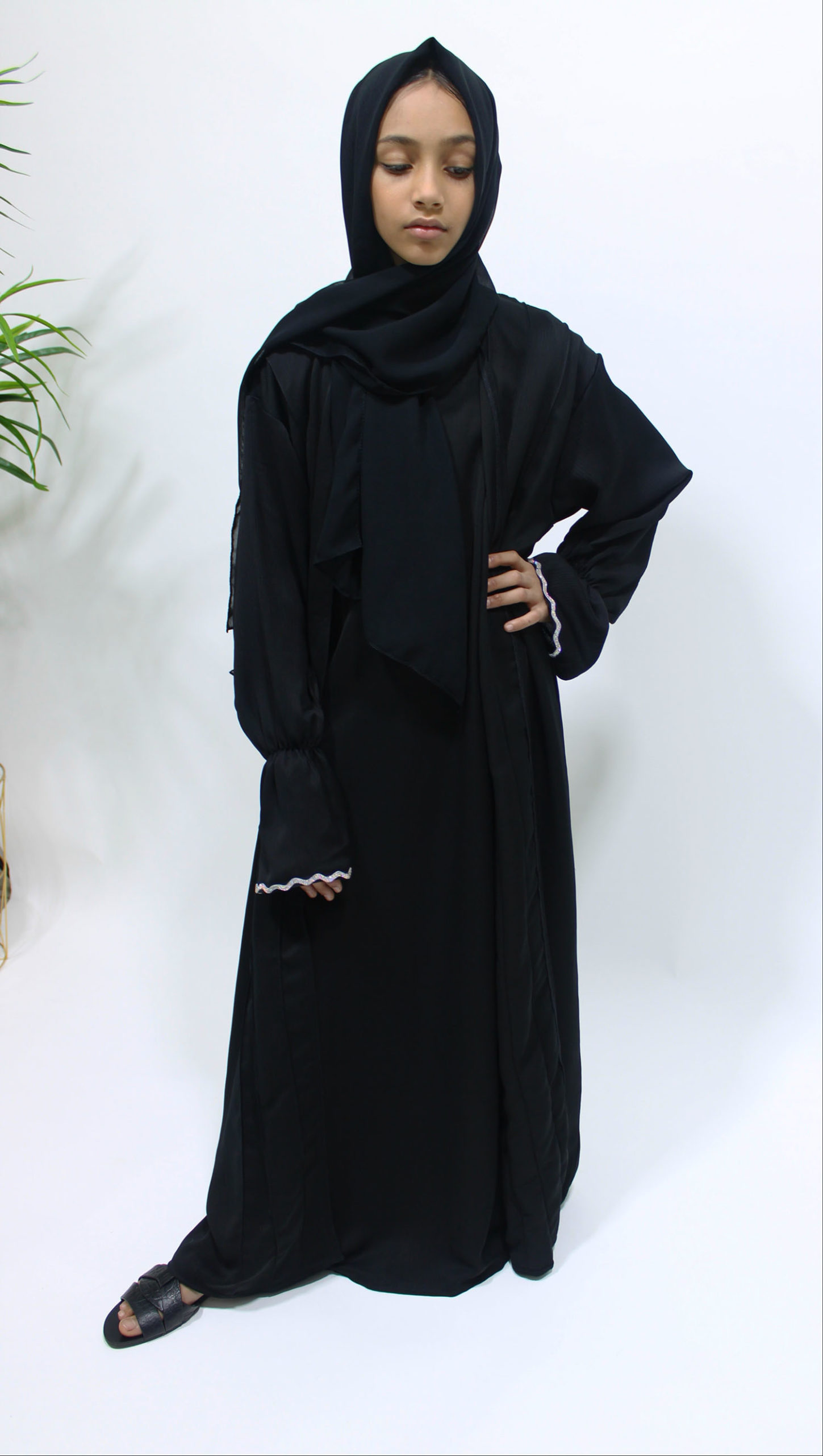 Classic and modest for every day. This black two-piece style abaya is actually a single piece that gives the illusion of layered fashion. A staple for modest everyday wear, complete with matching scarf.